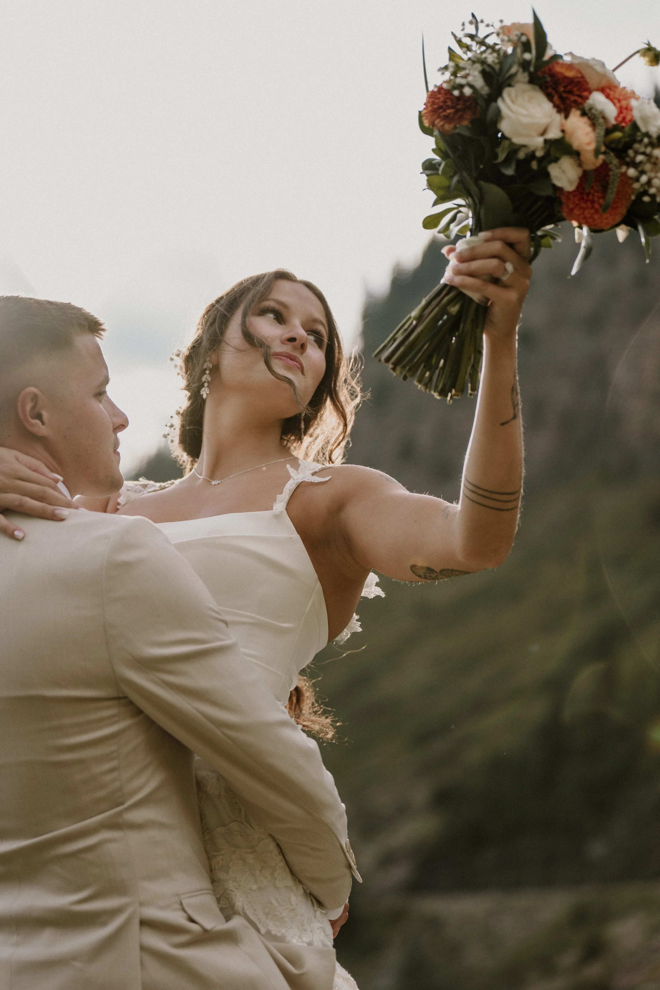 From wide-open valley views to alpine overlooks, every stop felt like it belonged in a postcard. Whether standing quietly together or laughing between moments, Logan and Canon soaked in every second of their wedding day adventure.